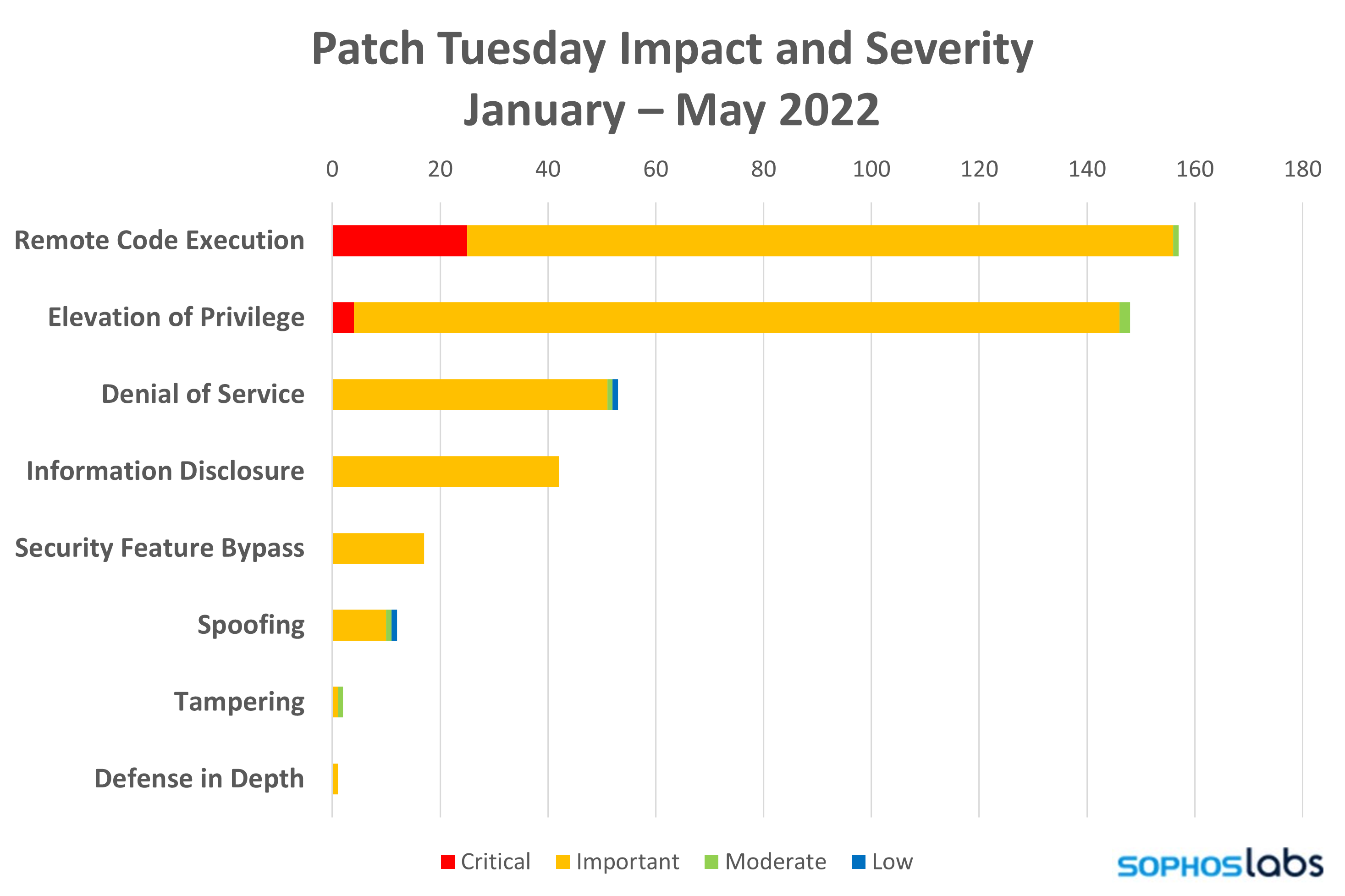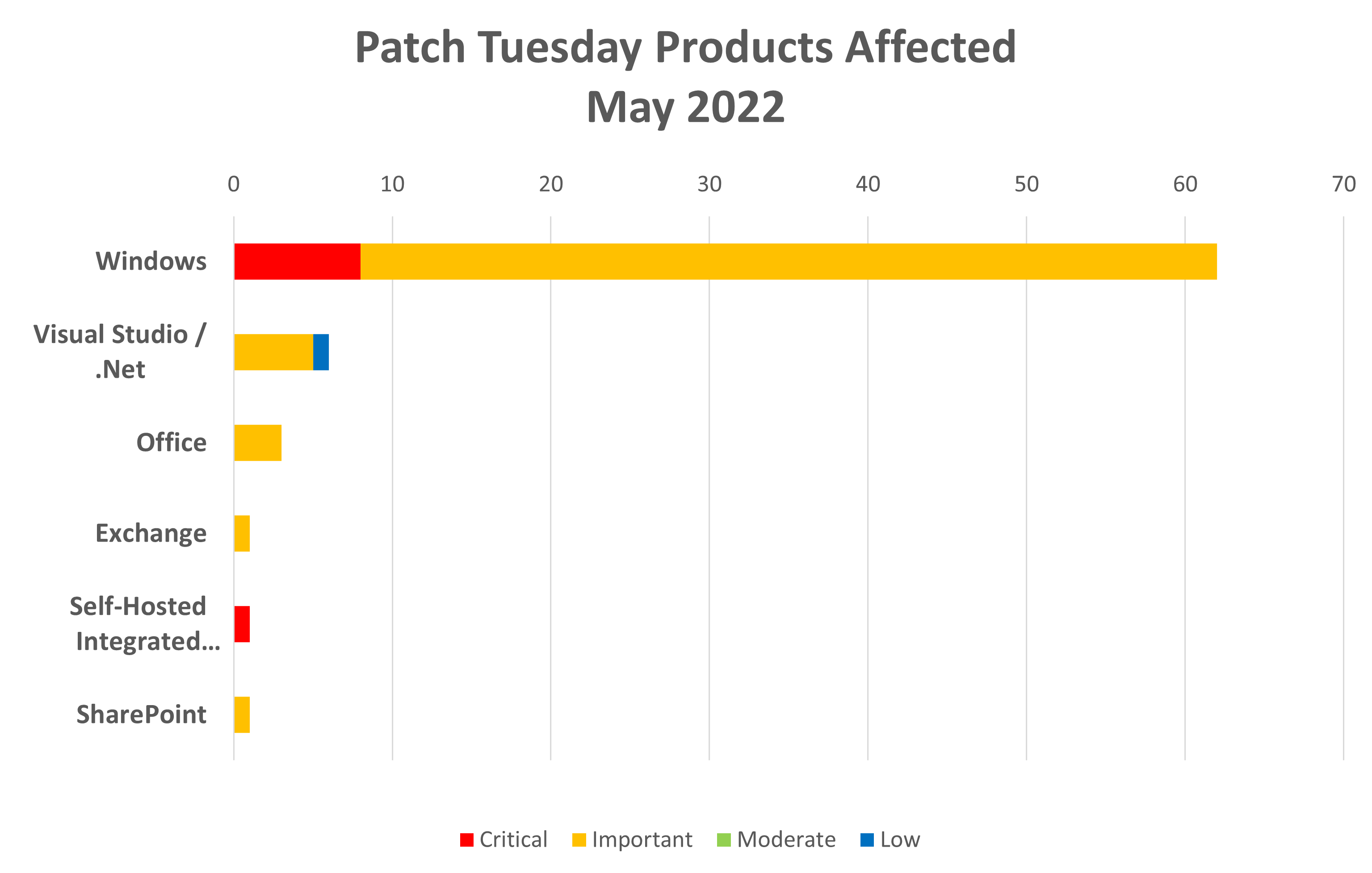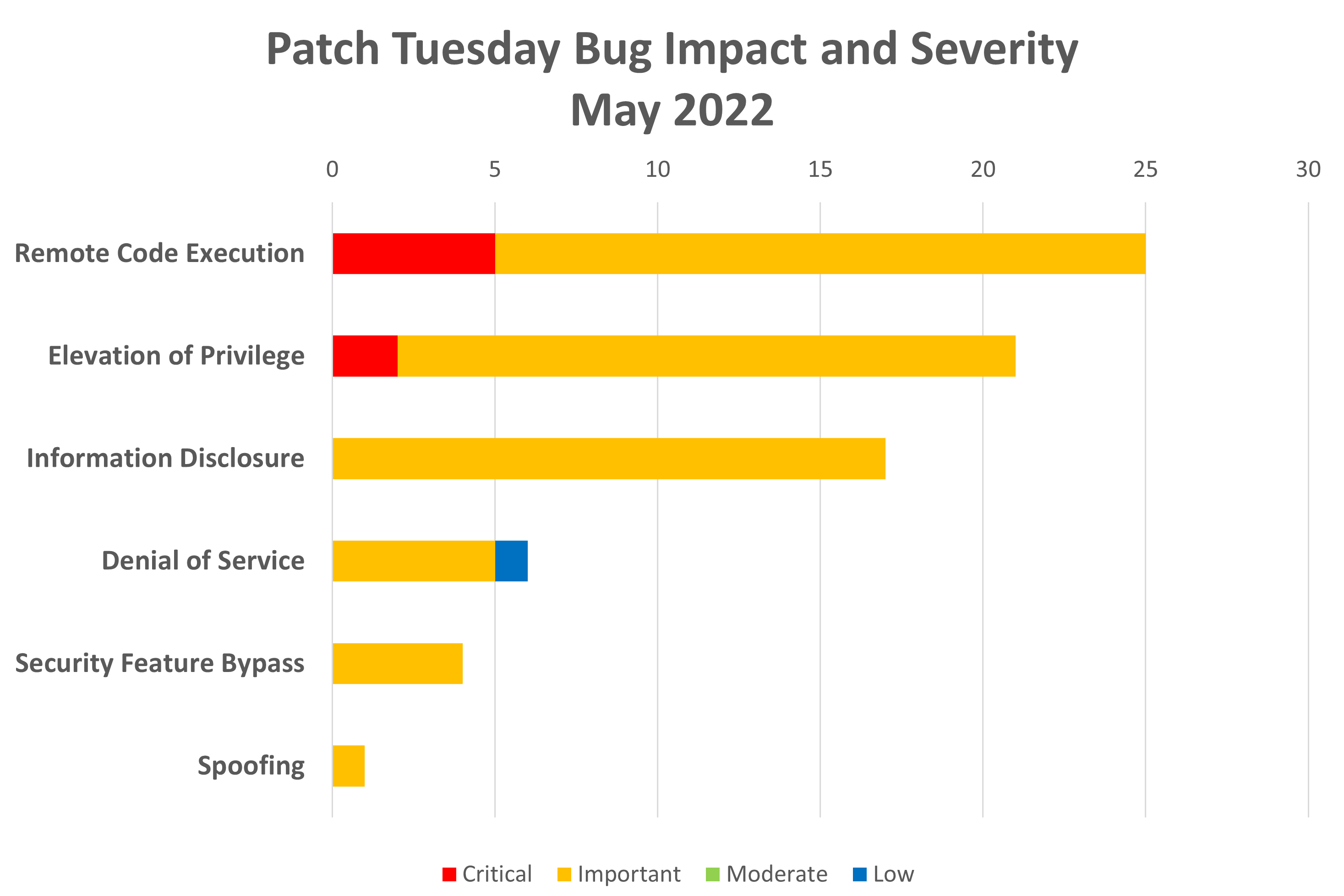 The May 2022 Patch Tuesday release is moderate in volume but relatively light in severity. Microsoft patches 74 vulnerabilities this month. The vast majority of those are rated Important, and 60 of the 74 bugs affect Windows.
