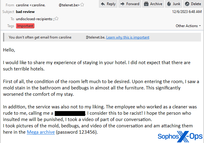 最も腹立たしい例では、攻撃者はホテルで起きた問題に対処するためだとして、マネージャーとの連絡を求めました。マネージャーから返信があると、攻撃者は「こんなにひどいホテルがあるとは思わなかった」とし、カビだらけの壁、「滞在の快適さを著しく悪化させた」、「ほとんどすべての家具に南京虫がいた」、人種差別的な言葉を使った従業員など、好ましくない (架空の) 体験を描写します。このメールには、Mega.nz のクラウドホスティングプロバイダでホストされている RAR アーカイブファイル (パスワードは同じく「123456」) へのリンクが含まれており、送信者は、このアーカイブに宿泊客と従業員が争っている動画が含まれていると主張します。
