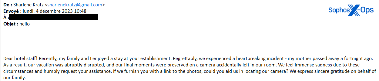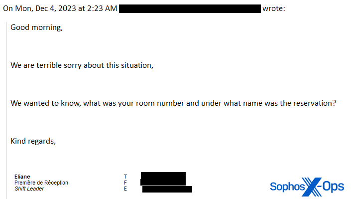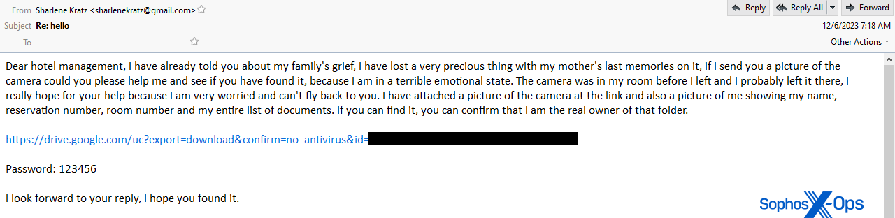 攻撃者は、2023 年 4 月の米国連邦税申告期限までの数か月間に Sophos X-Ops が発見した手口と同様のものを使用しています。攻撃者はまず、文字列のみの電子メールに、サービス業界の企業 (ホテルなど) が迅速に対応しようと思うような件名を付けて標的に接触します。標的が最初の電子メールに返信すると、攻撃者はリクエストや苦情に関する詳細情報だとするものにリンクする追加のメッセージを送信します。