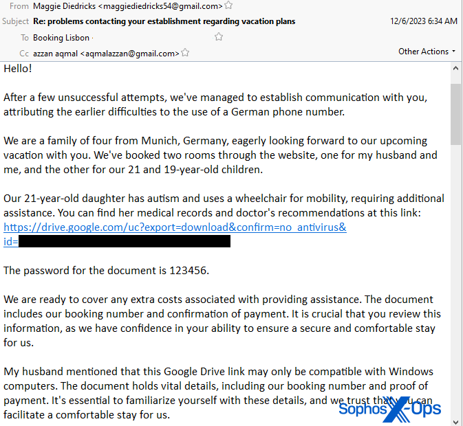 別の例では、攻撃者はホテルに電子メールを送り、「Web サイトや電話で連絡が取れなかった」として、返信を依頼しました。ホテルの予約担当者がプランの詳細を尋ねると、攻撃者は Web サイトを通じて部屋を予約したが、障害を持つ家族の宿泊の手配をする必要があるという返信をしました。2 通目のメールには、Google Drive でホストされている zip ファイルへのリンクが含まれていました。このファイルは「医療記録と医師の推奨」であると記載されており、やはりファイルを開くにはパスワード「123456」が必要です。
