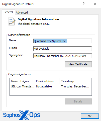 さらに、ほぼすべてのサンプルがコード署名証明書で署名されていました。証明書の多くは、キャンペーンの実行期間中に取得された新しいものでした。これらの証明書を照会したところ、多くのサンプルで署名が有効であることが判明しました。一方、偽造と思われ、検証に合格しないものもありました。
