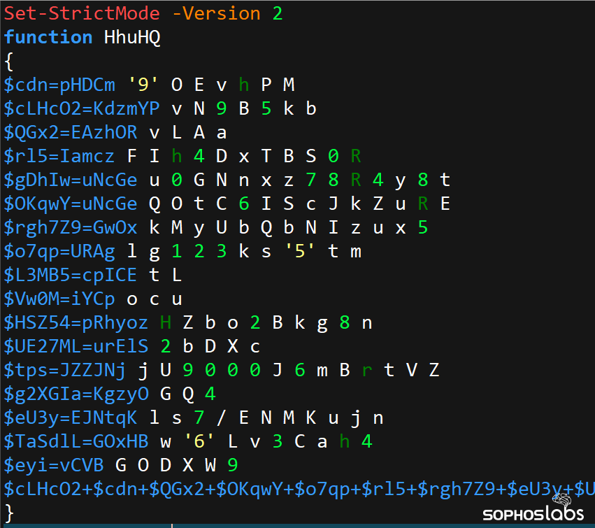 An example of the heavily obfuscated PowerShell scripts the attackers ran on several machines over the course of many weeks. The scripts use layers of obfuscation that self-expand when executed.