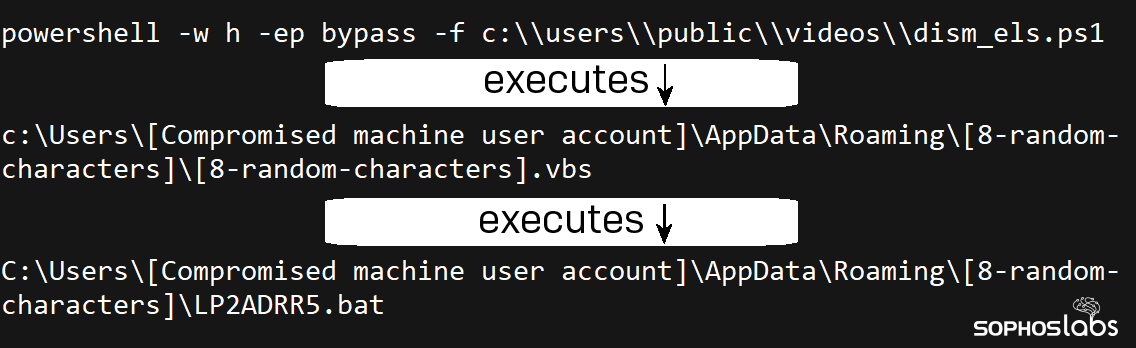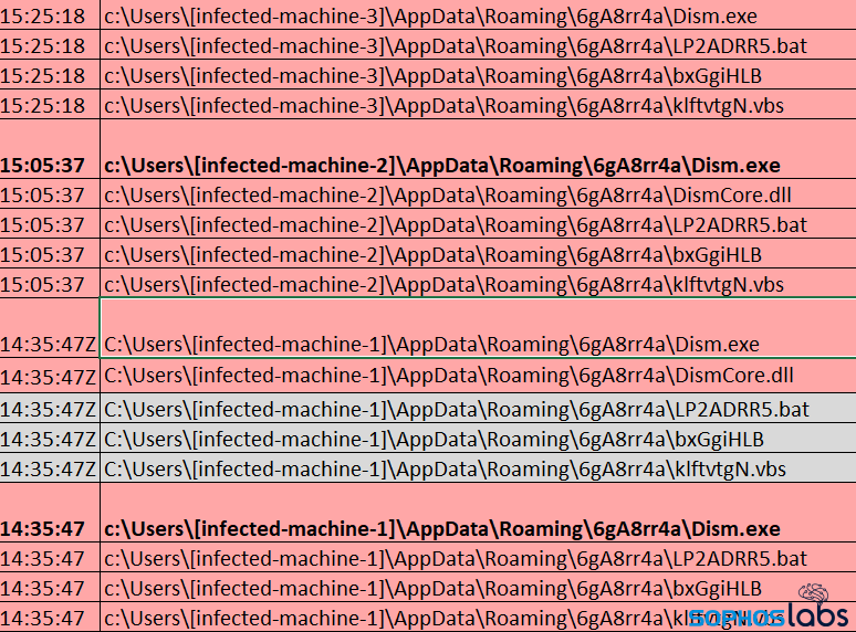 The attackers used oddly complex combinations of scripts to accomplish a single task. For instance, a PowerShell script would execute a Batch file, that in turn would launch a PowerShell script, that would run a command to invoke a DLL sideloading tool to inject a system process with the malicious DismCore.dll payload. We saw several instances of Visual Basic Script launch PowerShell, which then launched a batch script that invoked DISM to load DismCore.dll. The files involved had names of four, eight, or twelve random alphanumeric characters in length. Some of the PowerShell scripts used the file suffix .log instead of the default .ps1. A few used no file suffix at all.