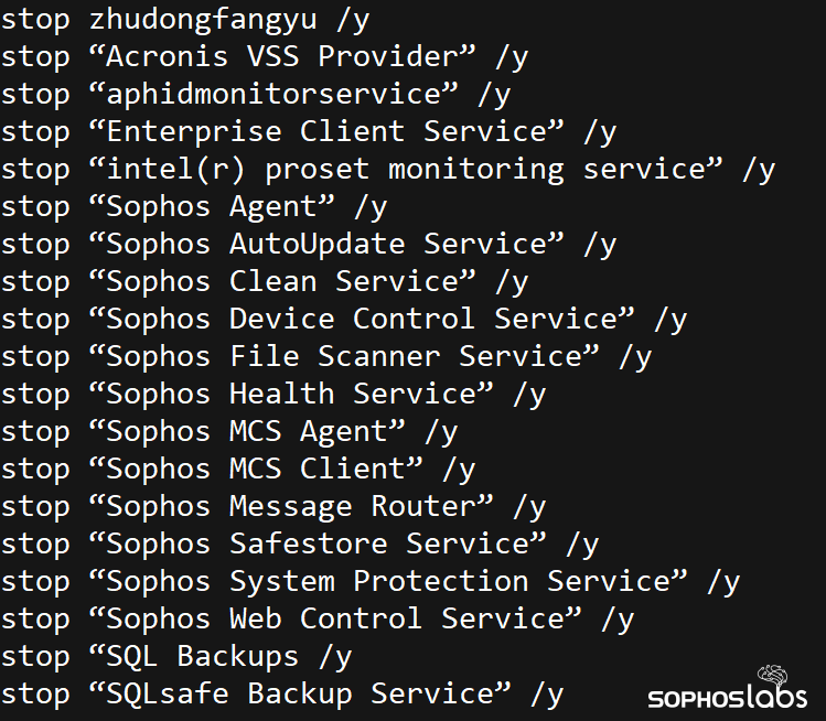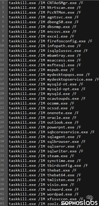 We also recovered PowerShell scripting commands that the attackers used in an attempt to shut down 46 processes, and 216 services, by name. These included services like MSSQL, various backup tools, office applications, and services tied to security software from McAfee, Kaspersky, Trend Micro, and Sophos, among others. The script that terminated services and processes had several redundant listings, which indicates the attackers were adding entries in the lists by hand, and not checking for duplicates.