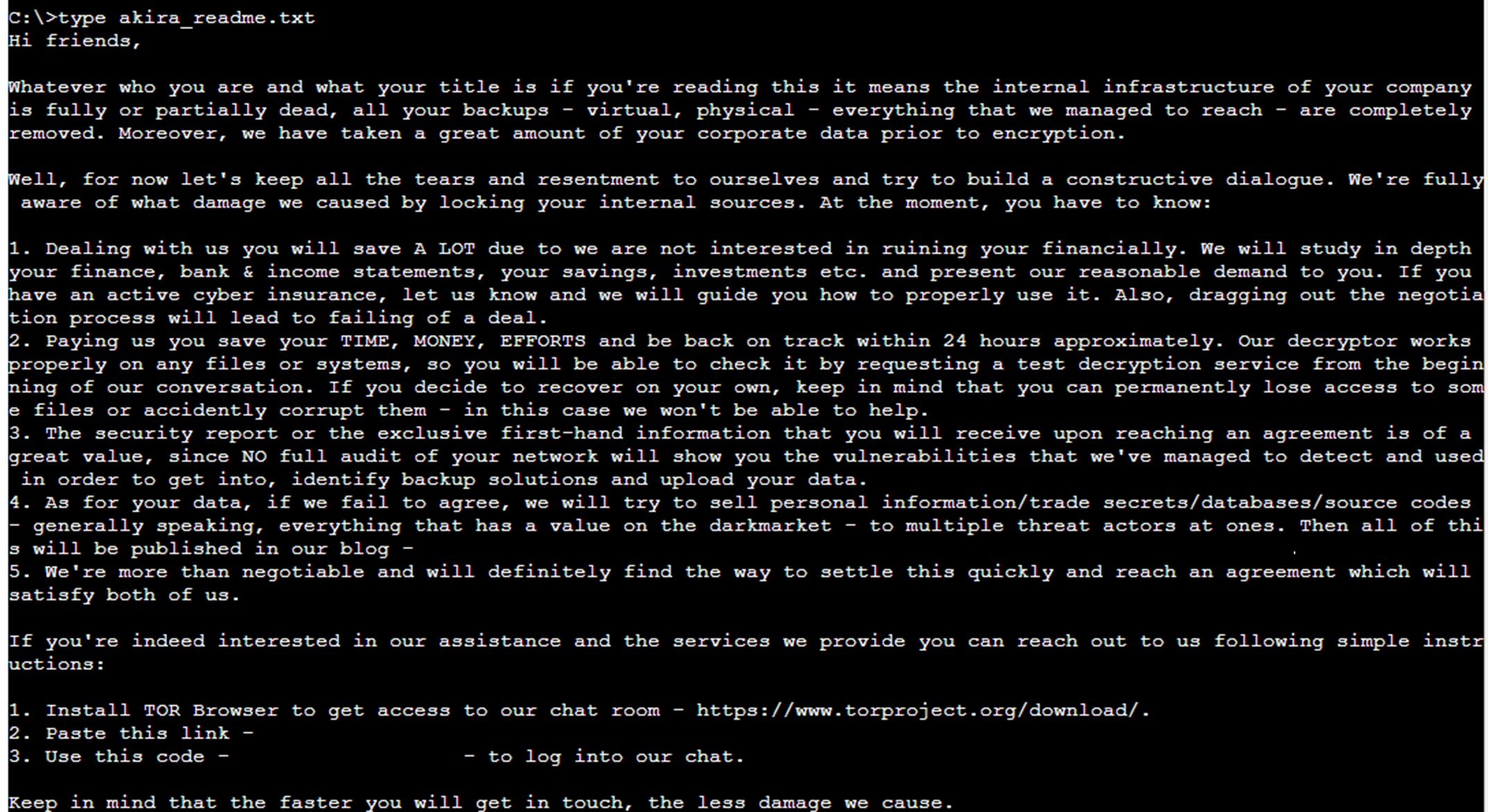 While the actors executed the ransomware manually on some servers during compromises, the primary mode of encryption was achieved over SMB. The ransomware, upon infection, encrypted files with the “akira” extension, created a ransom note named “akira_readme.txt” on impacted devices, and deleted the Volume Shadow copies.A ransom note received by an Akira victim (victim information redacted)