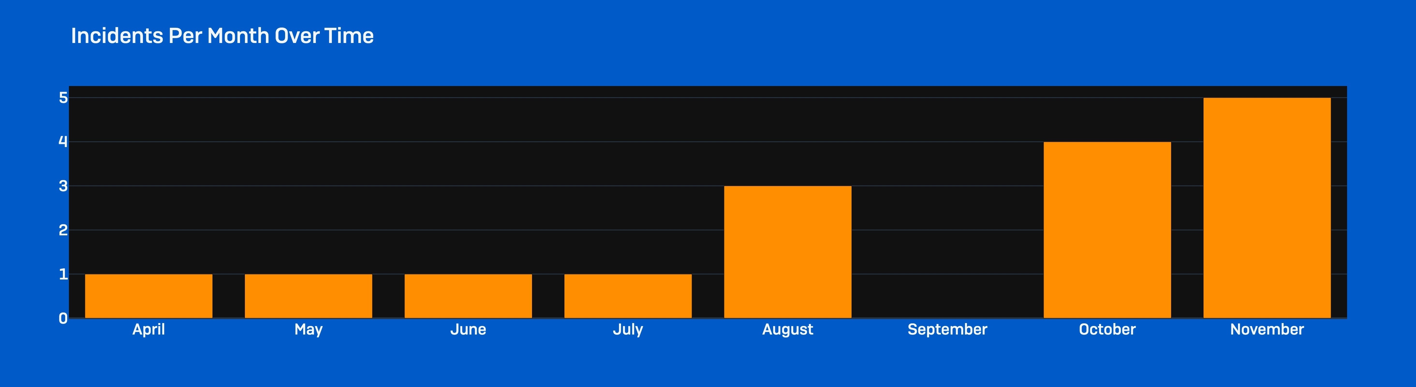 A bar chart showing total numbers of Akira cases handled by MDR between April and November, showing a rise over that timeFigure 1: Timeline of Akira ransomware attacks observed by Sophos