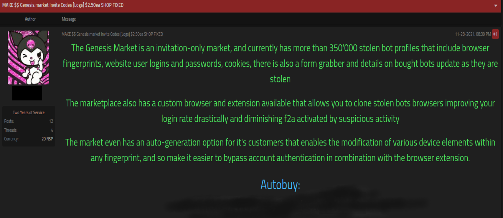 As mentioned, Genesis is an invite-only service, which has created demand by would-be bad guys for initial access to such a service. This demand creates a secondary marketplace providing matchmaker-like access for threat actors and invitation-only platforms such as Genesis, such as that shown in Figure 3: