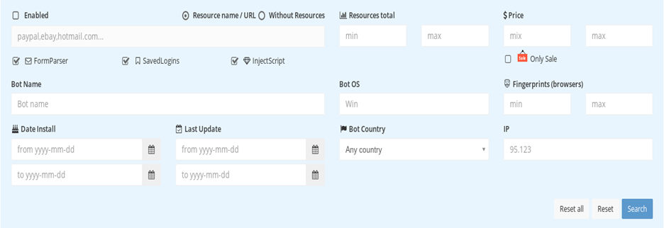 Figure 5: The Extended Search screen showing the URL of the targeted service, the IP address of the bot, country, operating system in use, and date parameters
