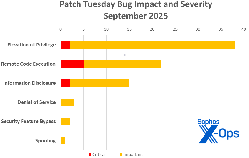 As is our custom for this list, CVEs that apply to more than one product family are counted once for each family they affect. We note, by the way, that CVE names don’t always reflect affected product families closely. In particular, some CVEs names in the Office family may mention products that don’t appear in the list of products affected by the CVE, and vice versa. (CVE-2025-54907, “Microsoft Office Visio Remote Code Execution Vulnerability,” is an excellent example of this for September; Visio does not appear in the list of products affected by this issue.)