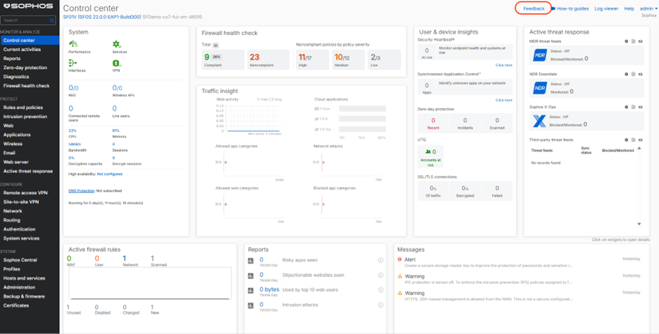 Please provide feedback using the option at the top of every screen in your Sophos Firewall as highlighted below in red or via the Community Forums.