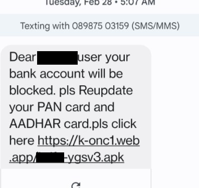 It’s tax season in many parts of the world and the end of the fiscal year in others, giving attackers a hook on which to hang an annual round of themed attacks. India’s fiscal year ended on 31 March, and as happens all over the world, threat actors are targeting those completing tax-returns and end-of-year financial updates. We are monitoring a smishing campaign in which malicious SMS texts are being sent out trying to trick users of certain Indian banks.