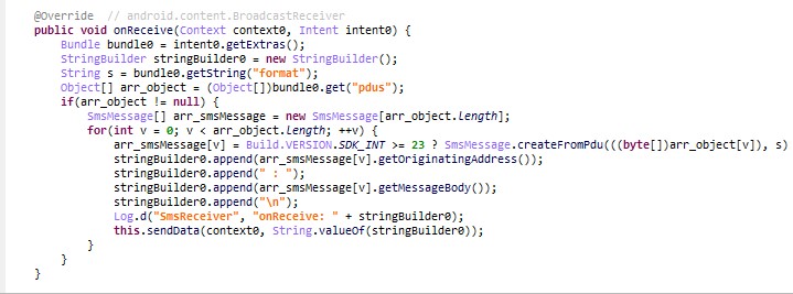 The APK also has the ability to read contents of SMS texts when they are received, possibly to extract any OTP codes issued by the bank, as shown in Figure 4.