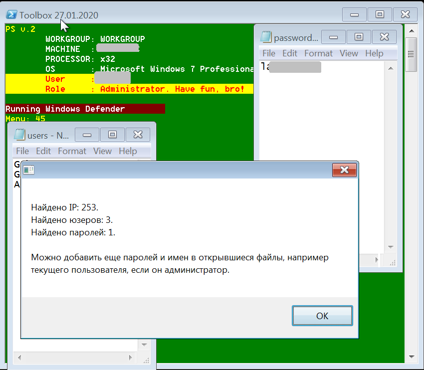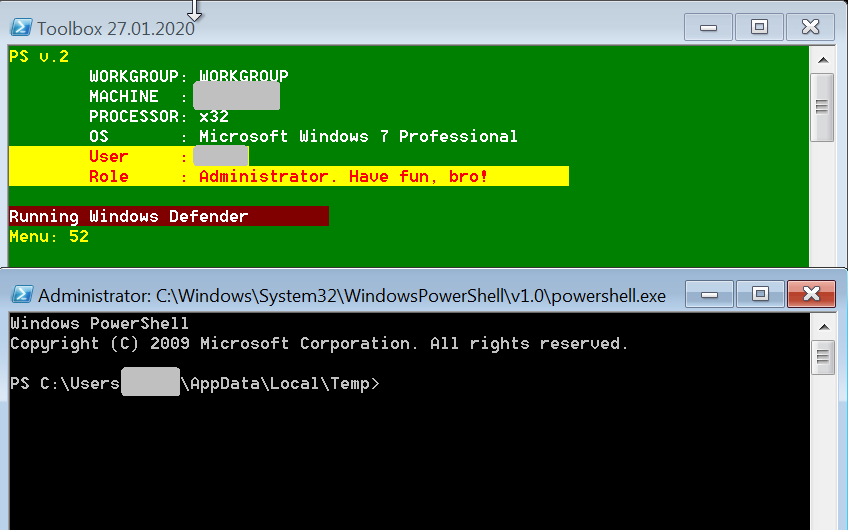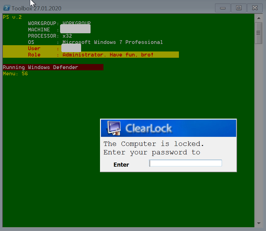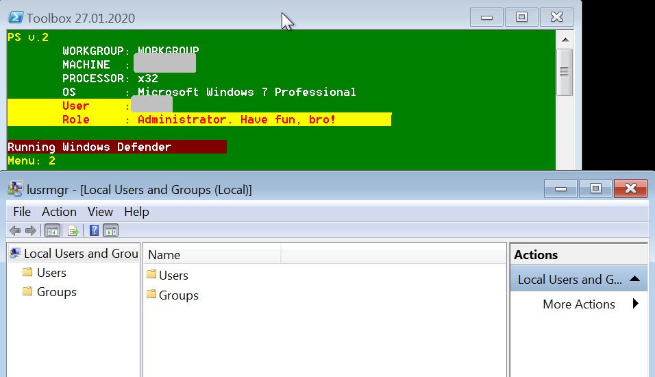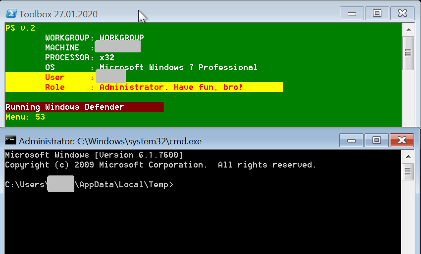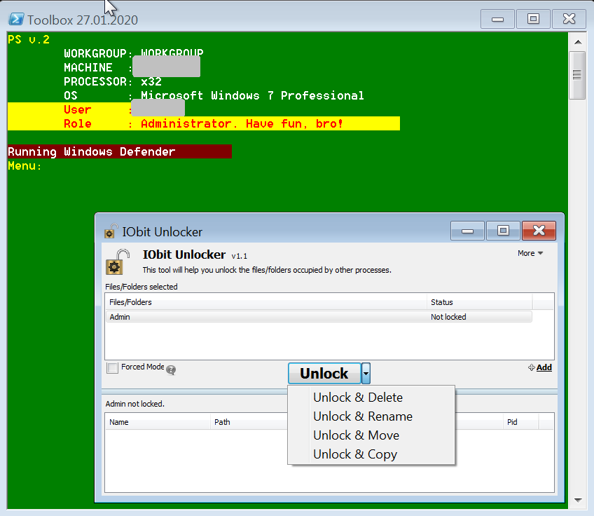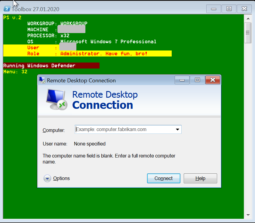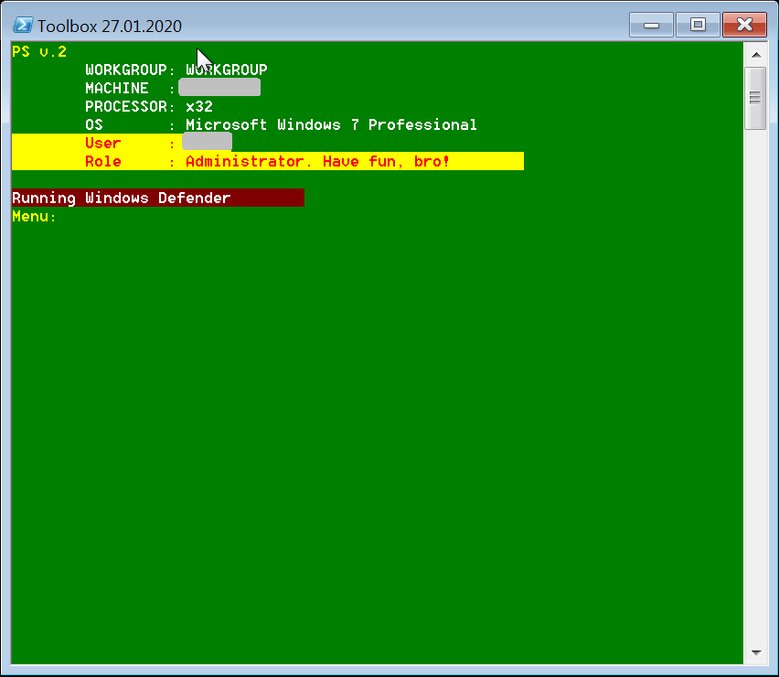 When executed, it identifies itself in the console frame as “Toolbox,” and if executed with administrative privileges, advises the user/attacker, “Have fun, bro!”