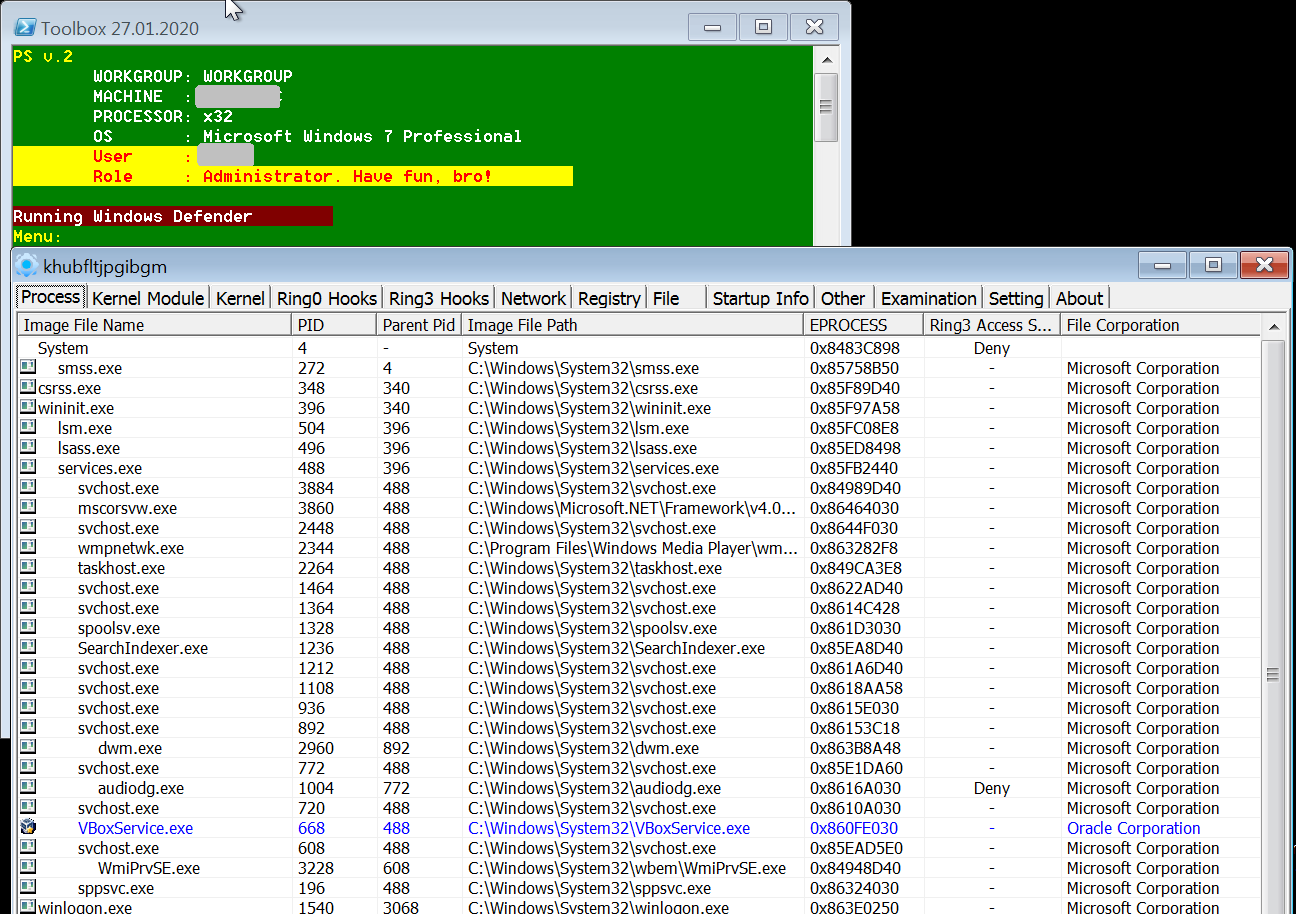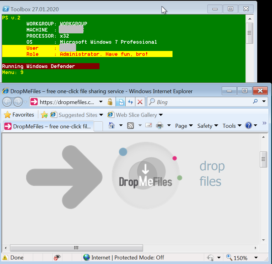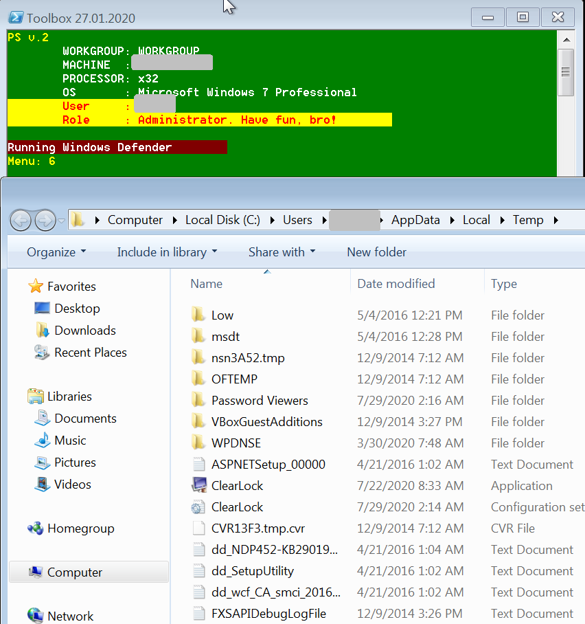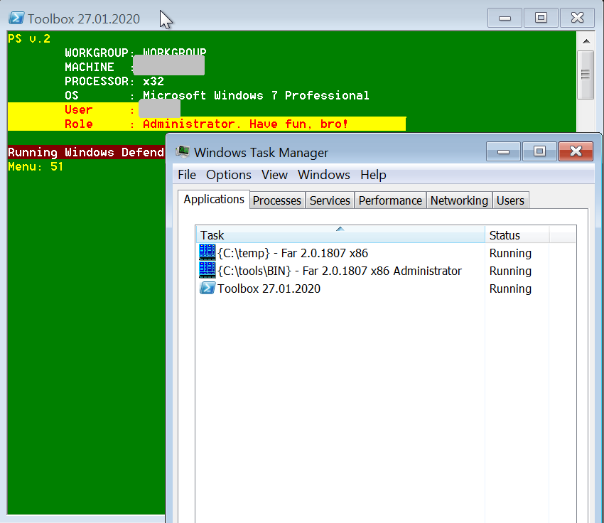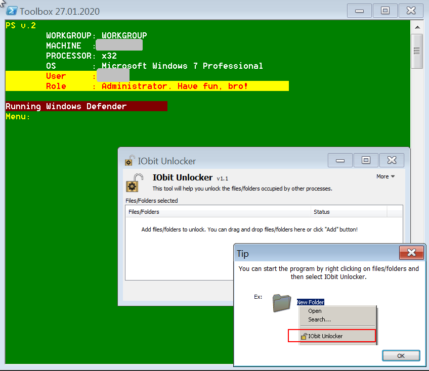 When executed, it identifies itself in the console frame as “Toolbox,” and if executed with administrative privileges, advises the user/attacker, “Have fun, bro!”