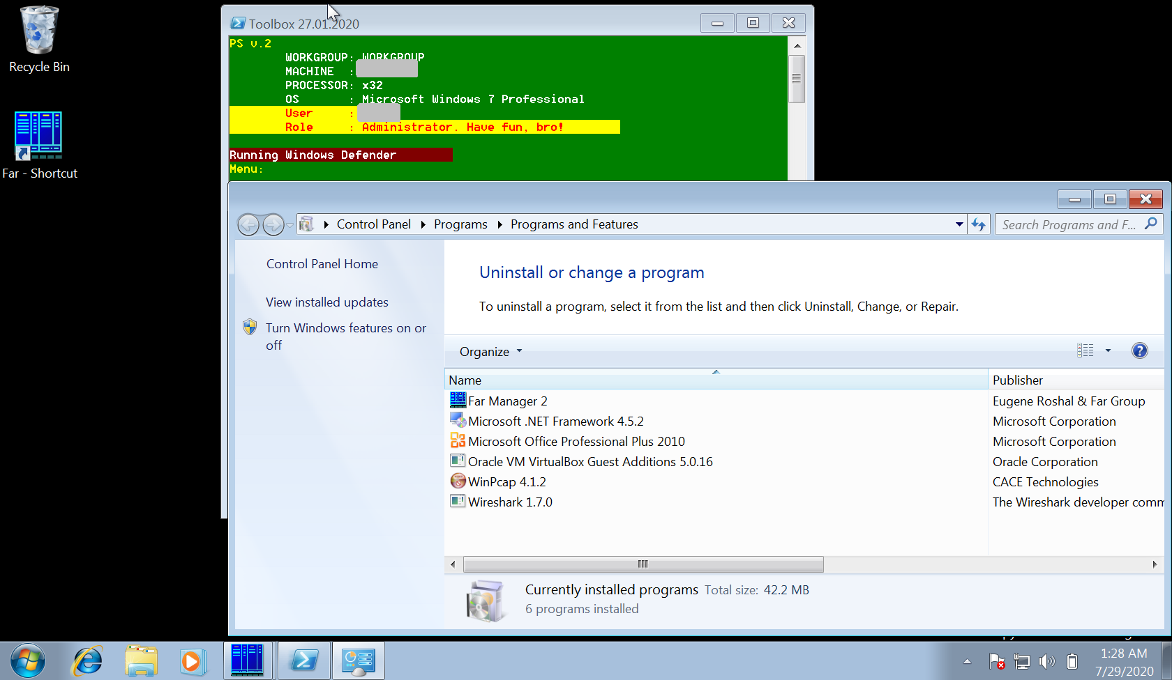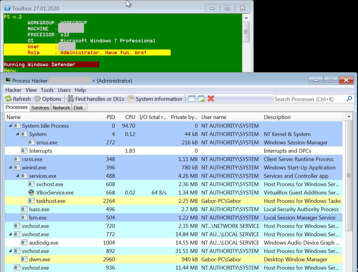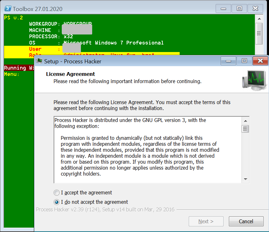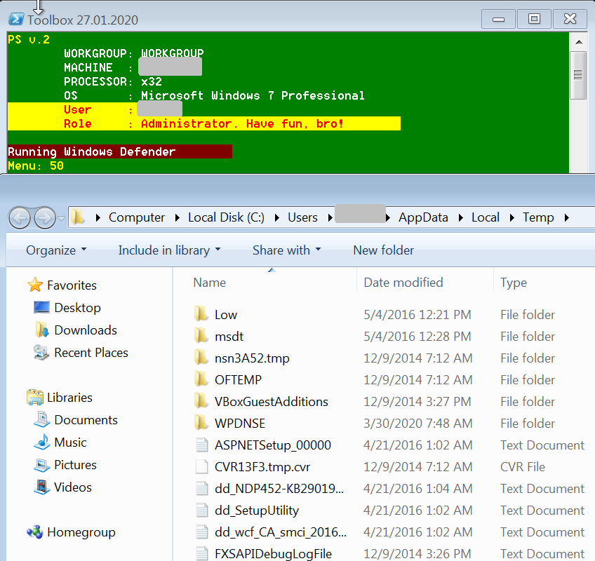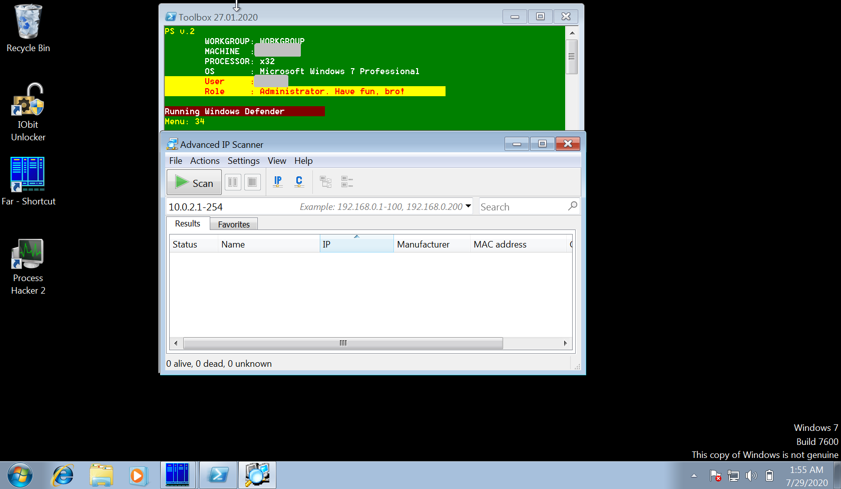 When executed, it identifies itself in the console frame as “Toolbox,” and if executed with administrative privileges, advises the user/attacker, “Have fun, bro!”