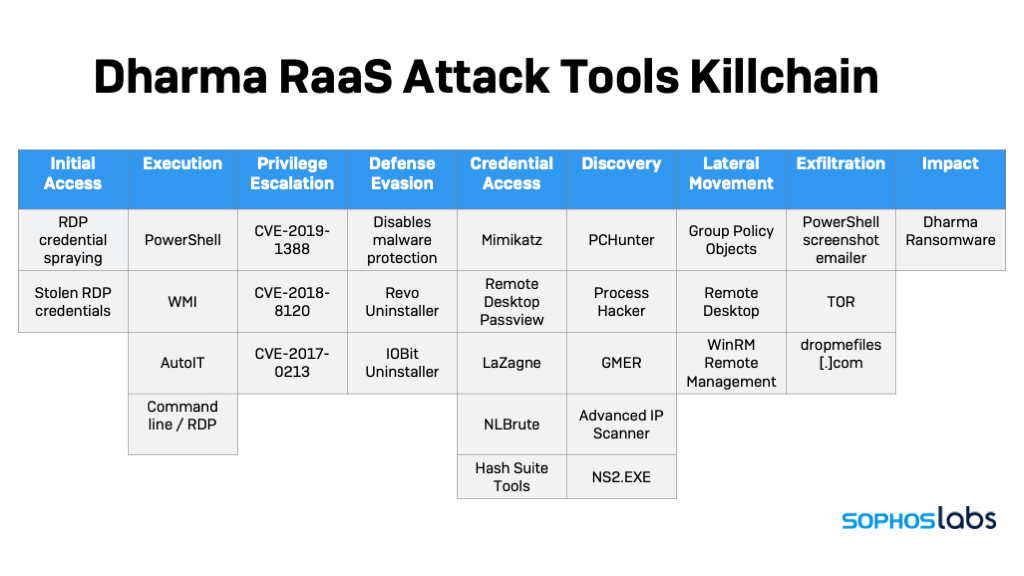 The actors using this particular RaaS are equipped with a package of pre-built scripts and “grey hat” tools that requires relatively little skill to operate. The Dharma operations we’ve documented use a combination of internal Windows tools, legitimate third-party “freeware” software, well-known security tools and publicly-available exploits, integrated together through bespoke PowerShell, batch, and AutoIT scripts. This pre-packaged toolkit, combined with back-end technical support, significantly extends the reach of the Dharma RaaS operators, allowing them to profit while their afililates do the hands-on-keyboard work of breaching networks, dropping ransomware, and managing “customer service” with the victims.