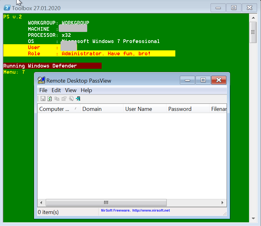 | 7 | Copies and and executes the NirSoft Remote Desktop PassView password viewer tool. |