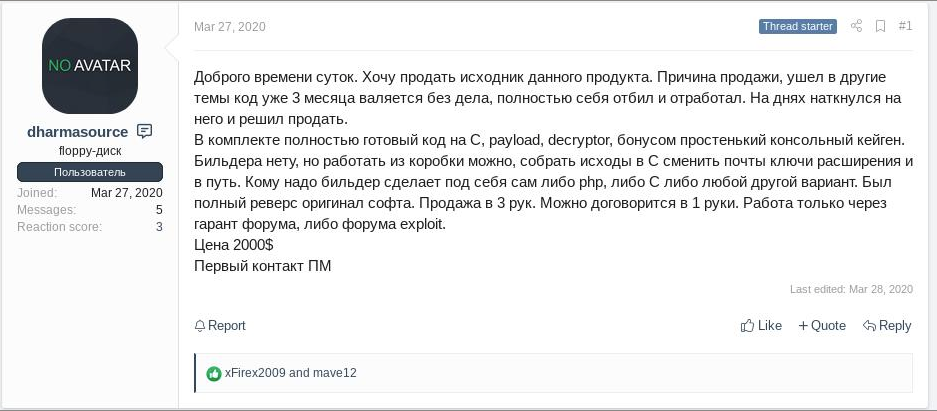 Dharma, formerly known as CrySis, has many variants, due to the sale and modification of its source code to multiple malware developers. Those transfers aren’t necessarily from the malware’s original authors, either—in March, a collection of source code for one variant of Dharma was offered for sale on Russian-language crime forums for $2000 through an intermediary.