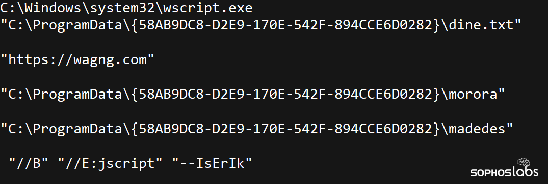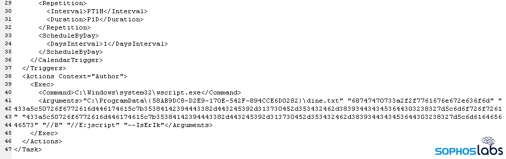 Using the beacon to upload files and execute commands on the now-compromised server, the attackers dropped several files into C:\ProgramData\{58AB9DC8-D2E9-170E-542F-894CCE6D0282}\ and then created a Scheduled Task that used the Windows Script Host wscript.exe to execute the file while passing it a hexadecimal-encoded set of parameters: