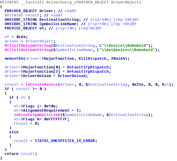 The following string was found in the malicious driver, indicating it was likely built by the same authors behind the RobbinHood ransomware.