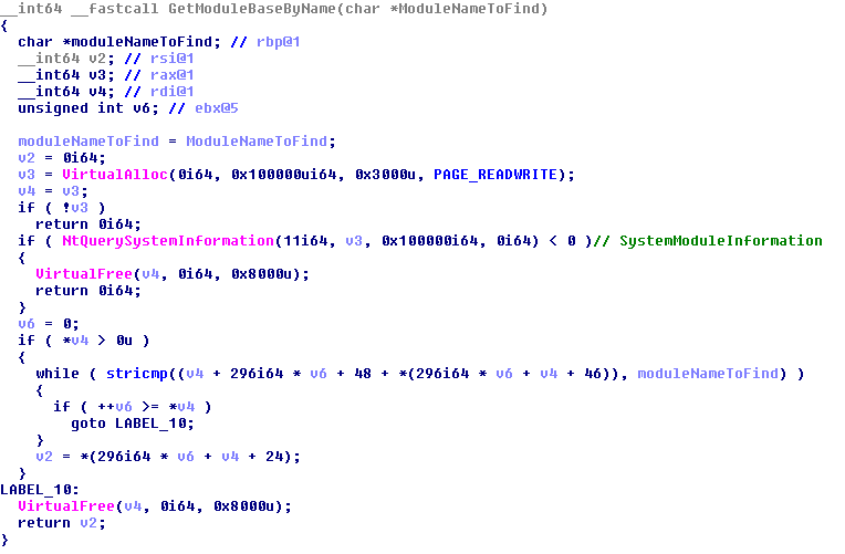 On Windows 8 or 10, the trick starts by loading the standard Windows component CI.DLL as a data library using DONT_RESOLVE_DLL_REFERENCES in their process. Once CI.DLL is loaded, they query the location of CI.DLL in kernel memory via the GetModuleBaseByName function. It uses NtQuerySystemInformation(SystemModuleInformation …) to get the kernel addresses of all loaded kernel modules.