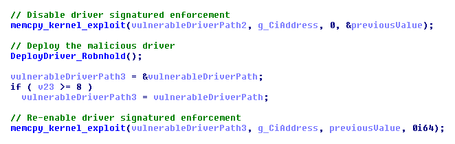Now that they know the location of the g_CiOptions variable in kernel space, the vulnerable third party driver is dropped to disk and started. See this article on the exact vulnerability. Any vulnerable driver that allows arbitrary read/write in kernel will do. So even though the attackers are using the GDRV.SYS driver to do this today, there’s no reason they will continue to use it if it becomes untenable to do so.