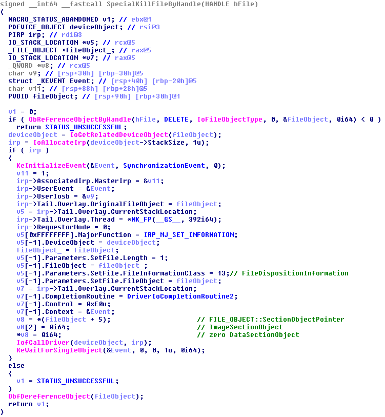 To delete files that are in-use the malicious driver issues an I/O Request Packet (or IRP, a low-level message passed between device drivers) directly on the NTFS.SYS storage device. By clearing the ImageSectionObject and DataSectionObject pointers, the storage device assumes the files are not in-use and the file is safely deleted, even when the file is still running as a process!