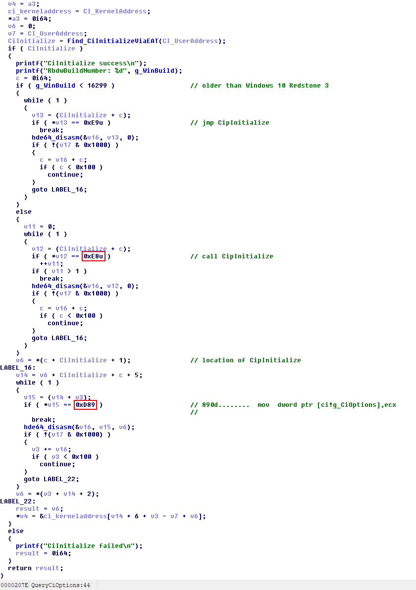 Once they know those kernel addresses, the attackers resolve the exported CiInitialize function from the module’s export address table.Then they disassemble the instructions of that function in order to find the call CipInitialize() instruction. Once that function is found, they look for the mov dword ptr [address],ecx instruction. That address is g_CiOptions as shown in the figure below.