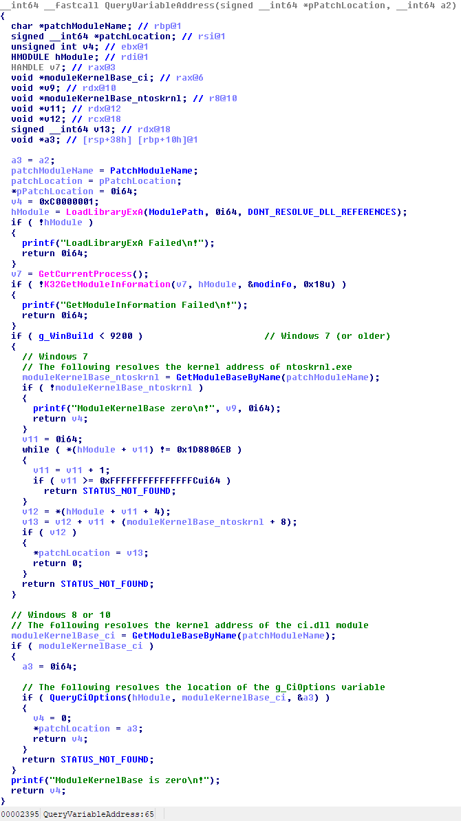 The attackers are able to disable driver signature enforcement by changing a single variable (a single byte) that lives in kernel space. On Windows 7 (or older), this variable is called nt!g_CiEnabled (NTOSKRNL.EXE). On Windows 8 and 10, this variable is called ci!g_CiOptions (CI.DLL). In order to resolve the location of this variable, the attackers use a strategy taken from DSEFix.