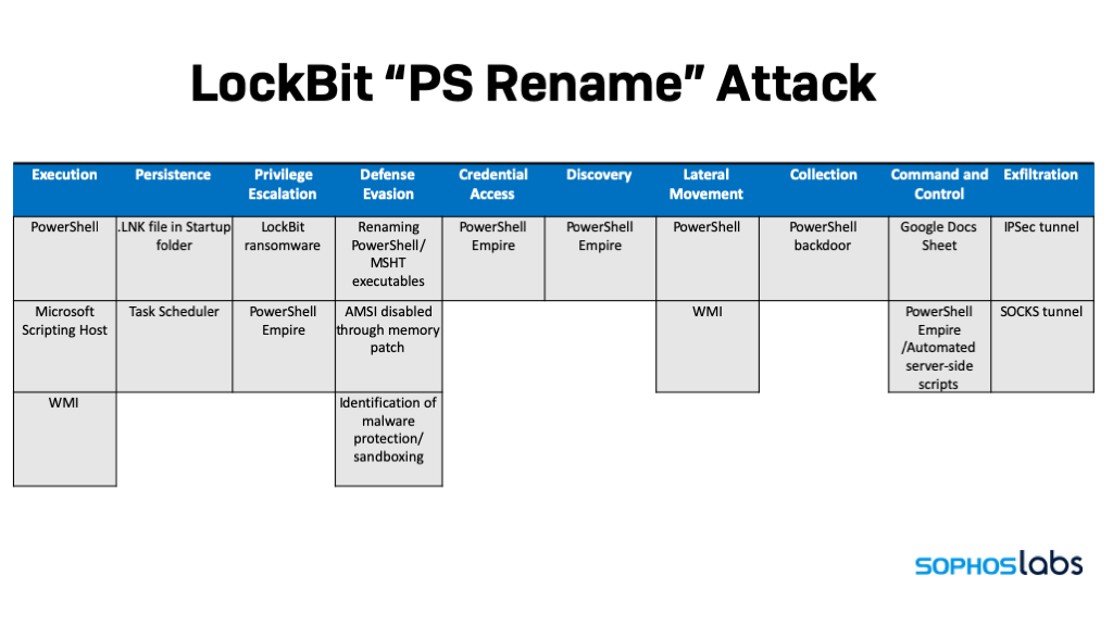 A series of recent attacks detected by Sophos provided us with the opportunity to dive deeper into LockBit’s tools, techniques and practices. The actors behind the ransomware use a number of methods to evade detection: calling scripts from a remote Google document, using PowerShell in a way that may foil some efforts at monitoring and logging to establish a persistent backdoor—by using renamed copies of PowerShell.exe. The attack scripts also attempt to bypass Windows 10’s built-in anti-malware interface, directly applying patches to it in memory. Internally, we’ve referred to this style of LockBit attack as “PSRename.”