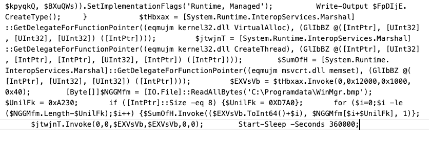 The ransomware chain is set off with the execution of run.bat, which creates a scheduled Windows task to execute clean.bat using the contents of WinMgr.xml to configure the task. When it is launched by the scheduler, clean.bat executes a base64-encoded PowerShell script that extracts the ProLock executable file encoded into the image file WinMgr.bmp, loads it into memory, and executes it—passing parameters that control the encryption. (When executed without the Powershell script, the executable runs—but doesn’t encrypt any files.)