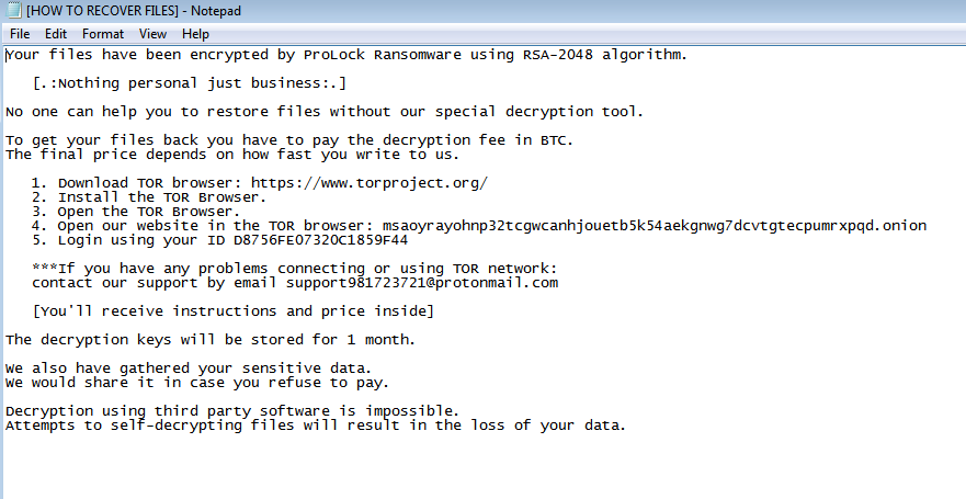 According to the FBI “flash”, victims of ProLock have included healthcare organizations, government agencies, financial institutions, and retailers. Victims are directed to contact the ProLock operators through a Tor-based ( .onion) web portal or a ProtonMail email address. Following the current trend in ransomware set by Maze, ReVil, and other established extortion operations, the ProLock actors “instruct victims to pay the ransom in several days, threatening to release the victims’ data on social media and public websites,” the FBI reports.