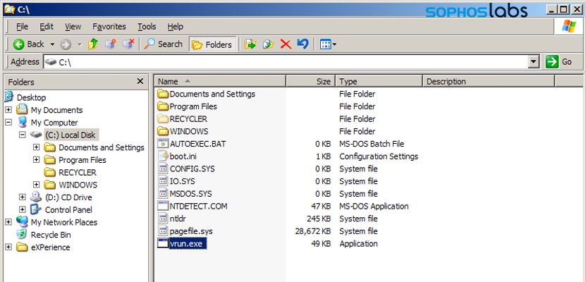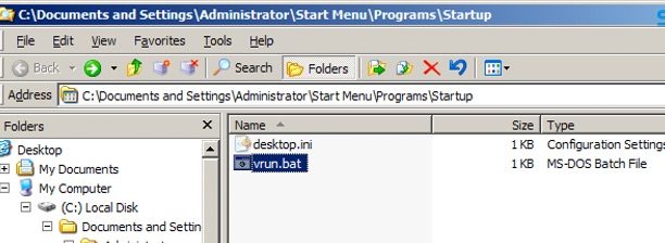 To start the ransomware, a batch file called vrun.bat is located in C:\Documents and Settings\Administrator\Start Menu\Programs\Startup\.