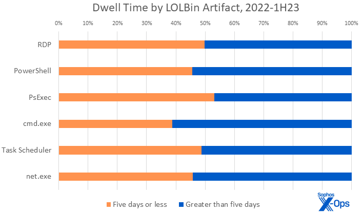 A bar chart indicating, for the most commonly noted LOLBin-related artifacts, the likelihood that the related attack lasts more than five days, versus five days or less