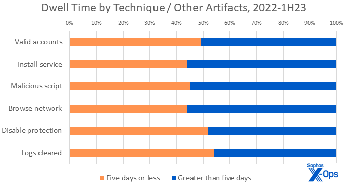 A bar chart indicating, for the most commonly noted technique-related artifacts, the likelihood that the related attack lasts more than five days, versus five days or less