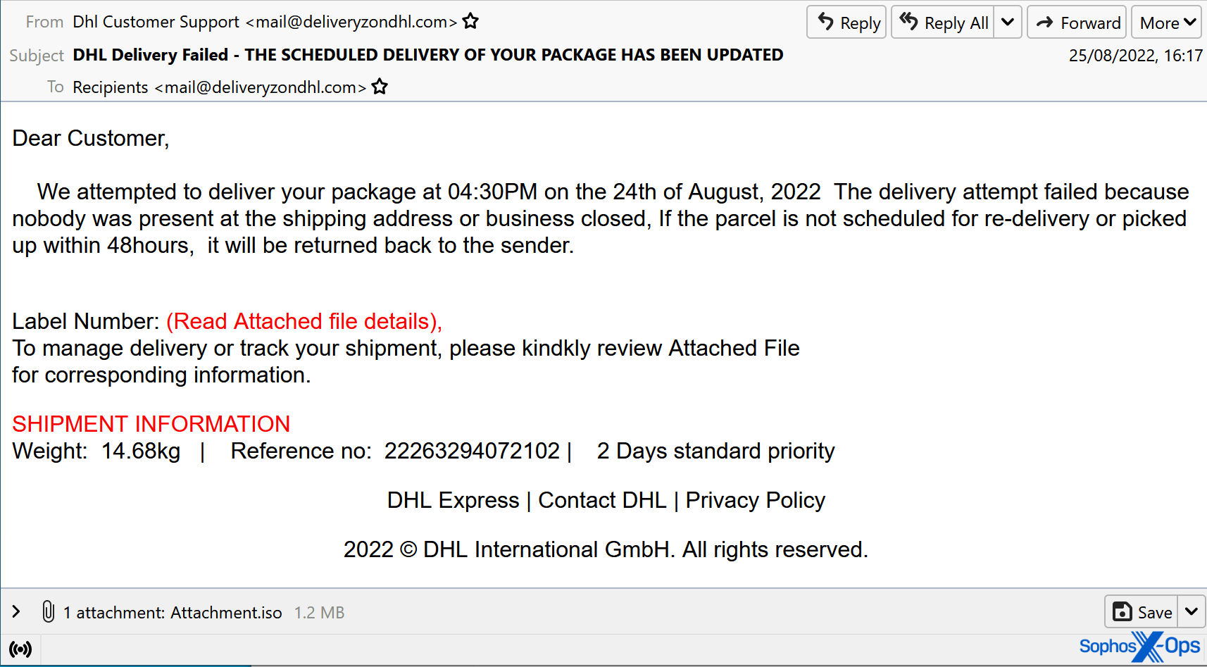 In other cases, the email may contain an ISO file or another disk image file as an attachment, as in this case: