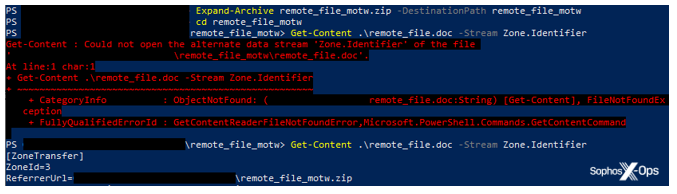 However, some archiver products and methods of extraction don’t propagate MOTW. In the screenshot below, for example, I’ve downloaded the same test file (this time archived as a ZIP file using WinZip). If I extract the contents with the Expand-Archive cmdlet in PowerShell, the MOTW is not propagated to the Word document. But if I unzip using Windows Explorer, and then check the ADS of the extracted document in my terminal, there’s an MOTW tag: