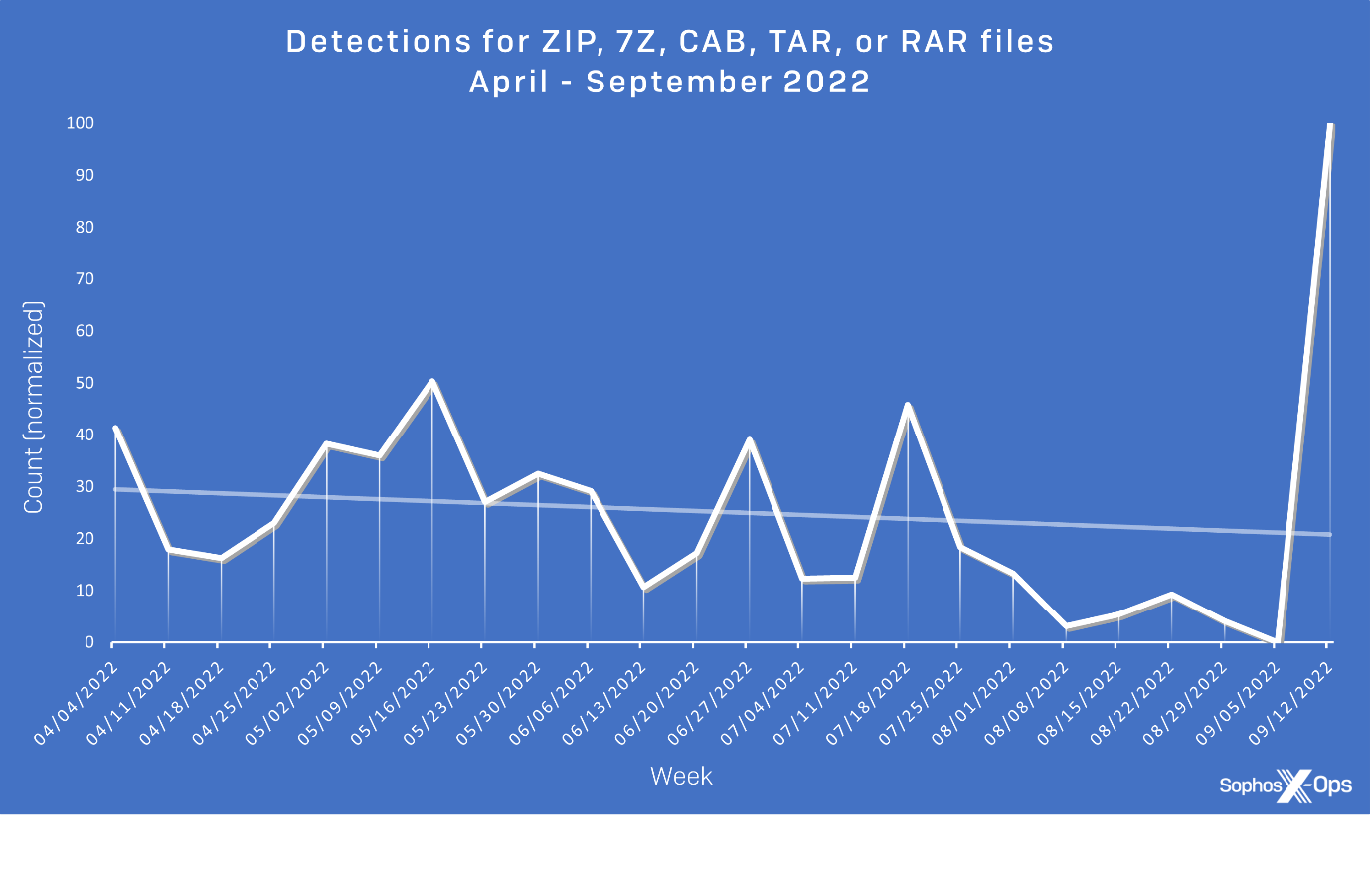 Figure 15: Detections for ZIP, 7Z, CAB, TAR, or RAR files between April and September 2022