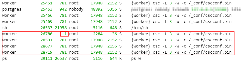 The b program, when run, deleted itself from the filesystem of the device, so it was only present in memory. It appeared in the process list as a program whose name, cssconf.bin, is one character off from a legitimate process that normally runs on a firewall, cscconf.bin. The highlighted process list below shows the malicious program as it would have appeared running on an infected firewall. It is also notable that it listed its parent process ID as 1, which the legitimate cscconf.bin would never have done.