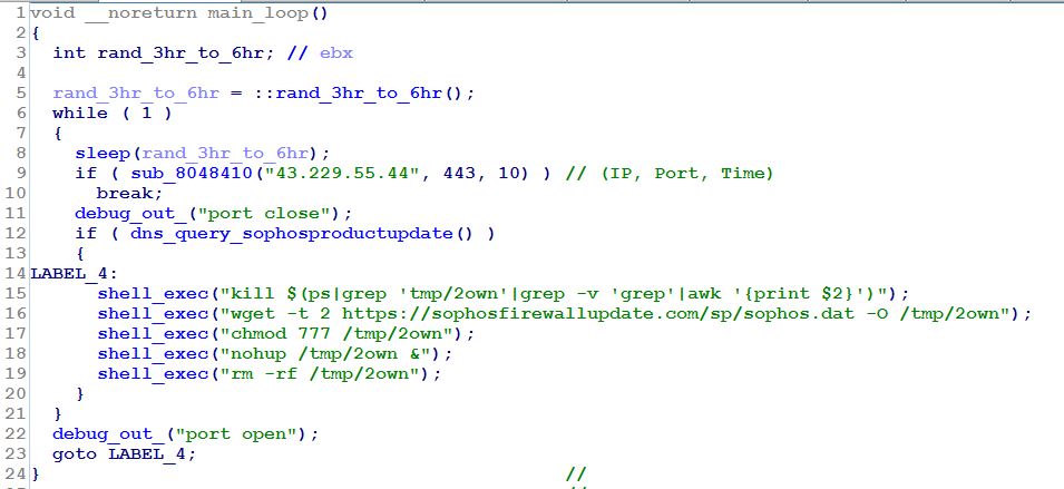 hxxps://sophosfirewallupdate.com/sp/Install.sh hxxp://sophosfirewallupdate.com/sh_guard/lc hxxps://sophosfirewallupdate.com/bk hxxps://sophosfirewallupdate.com/sp/lp hxxps://ragnarokfromasgard.com/sp/patch.sh hxxps://sophosfirewallupdate.com/sp/sophos.dat hxxps://sophosfirewallupdate.com/in_exit hxxps://sophosfirewallupdate.com/sp/lpin hxxp://sophosfirewallupdate.com/bkin hxxp://filedownloaderservers.com/bkin hxxps://sophosfirewallupdate.com/sp/p.sh hxxps://sophosfirewallupdate.com/sp/ae.sh