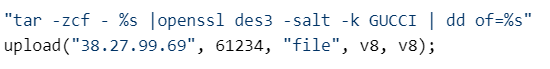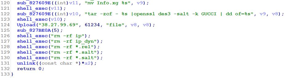 Once the malware wrote all this information to Info.xg, it then compressed it using the tar compression tool, and then used OpenSSL to encrypt the archive file. The attacker used the Triple-DES algorithm to encrypt the file, and for a pass phrase, the word “GUCCI” in all capital letters. The malware then intended to upload the encrypted file to a machine at the IP address 38.27.99.69, and then cleaned up its tracks by deleting the files temporarily created while it collected the information.