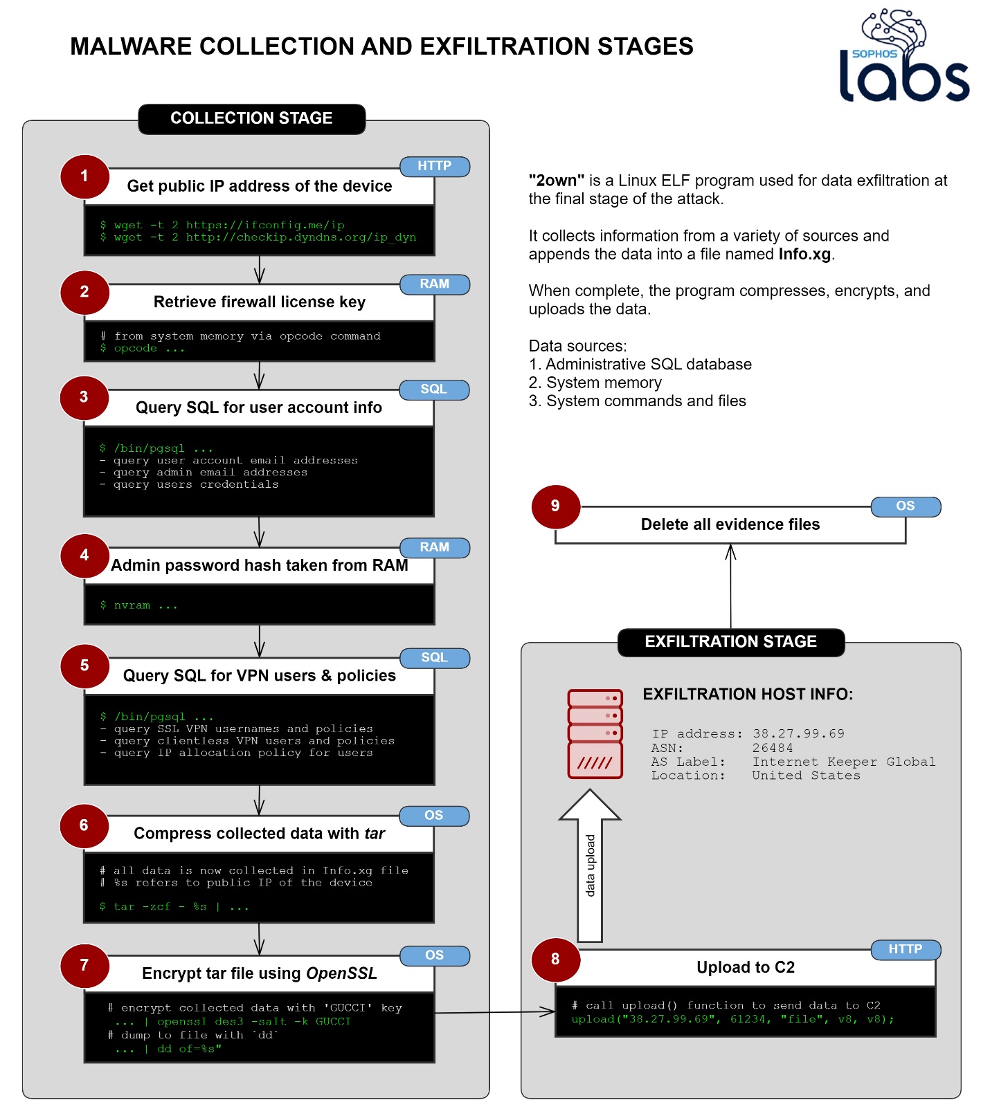This malware’s primary task appeared to be data theft, which it could perform by retrieving the contents of various database tables stored in the firewall, as well as by running some operating system commands. At each step, the malware collected information and then concatenated it to a file it stored temporarily on the firewall with the name Info.xg.