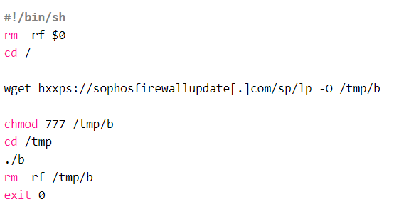 One of the dropped shell scripts was named .lp.sh and its primary function was to connect to the malicious sophosfirewallupdate site, and download a Linux ELF executable file compiled to run on the firewall operating system named lp. The script wrote that downloaded file to /tmp with a filename of just b.