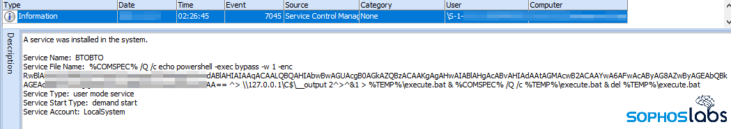 And in this case, there’s an Event Log entry that shows a base64-encoded PowerShell script being executed, with the results being output to a file called execute.bat, which is then run, and finally deleted.