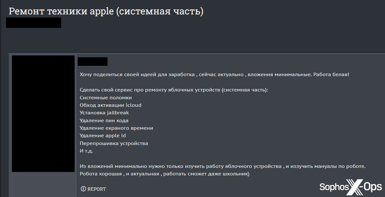 One threat actor recommended that their peers “create your own service for repairing Apple devices,” including bypassing iCloud activation, installing jailbreaks, removing Apple IDs, etc.