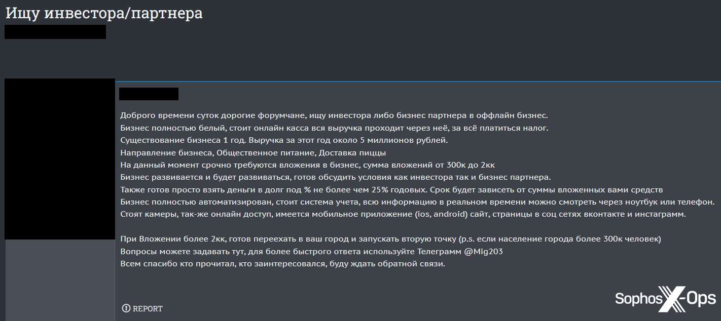 Figure 31: A threat actor seeks “an investor or business partner” in a pre-existing and “completely white” pizza delivery company